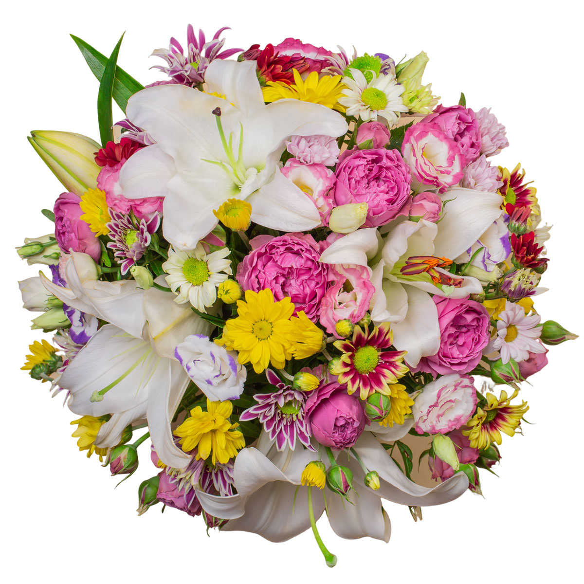 Лилия белая, хризантема кустовая желтая и сиреневая, роза кустовая пионовидная розовая, эустома бело-фиолетовая, фисташка. Упаковка (шляпная коробка, квадратный бокс, коробка сердце, оазис)